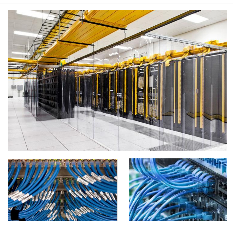 通过上走桥架,将线路自机柜顶部引入机柜,并接入网络接口模块,供网络跳线使用,同时根据实际需求部署机柜之间的网络连接。